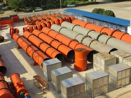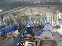 烘干機系統密封性能好,并配有完善的除塵裝置,粉塵小外溢,操作環境好。選用LX型多組合式揚料板,使物料進入烘干筒內呈雨狀料幕,增加了物料與熱空氣的接觸面,避免了熱空泛的發生